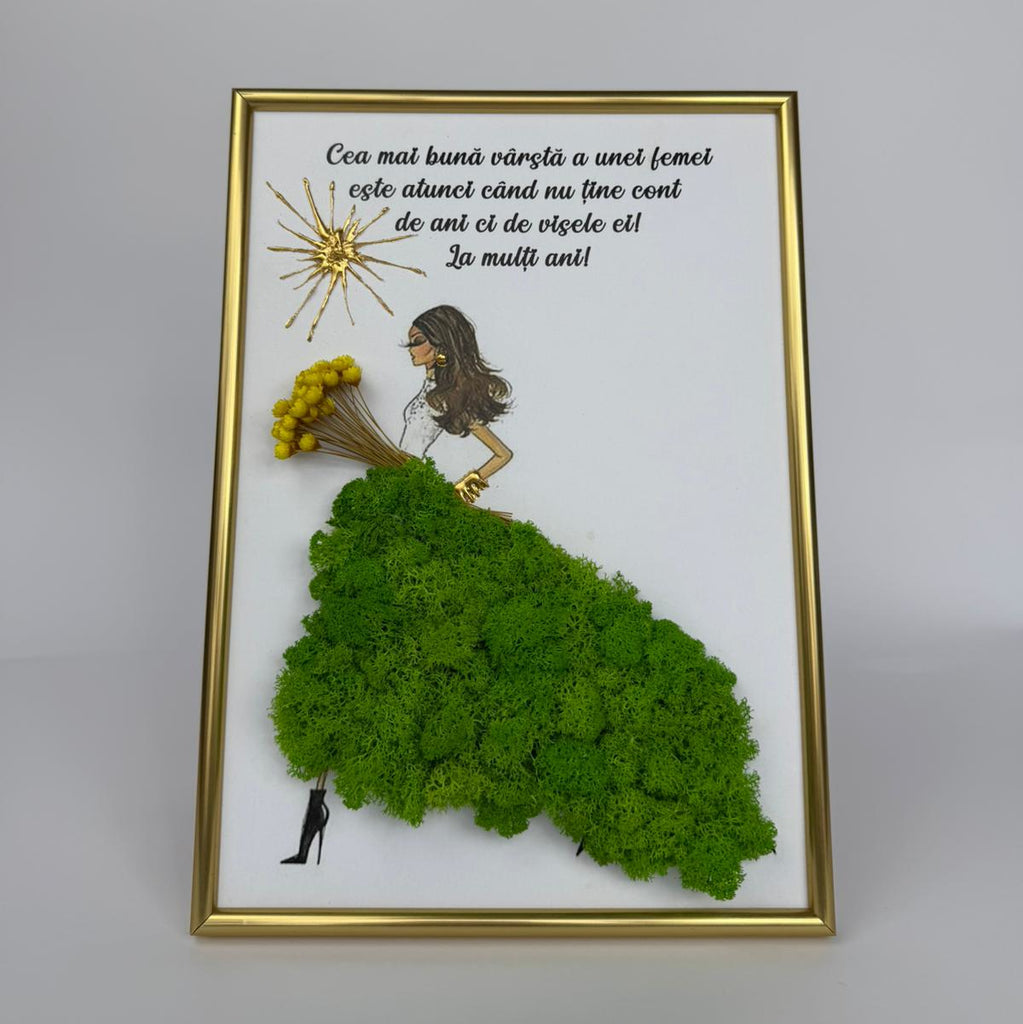 Tablou / Rama foto cu mesaj aniversar, cu licheni si plante stabilizate.