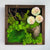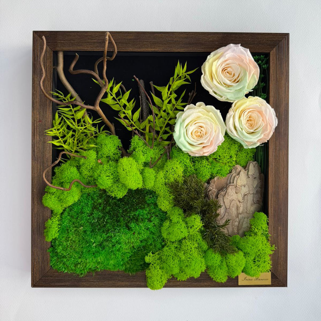 Tablou cu muschi si licheni, scoarta, trandafiri criogenati si plante stabilizate.