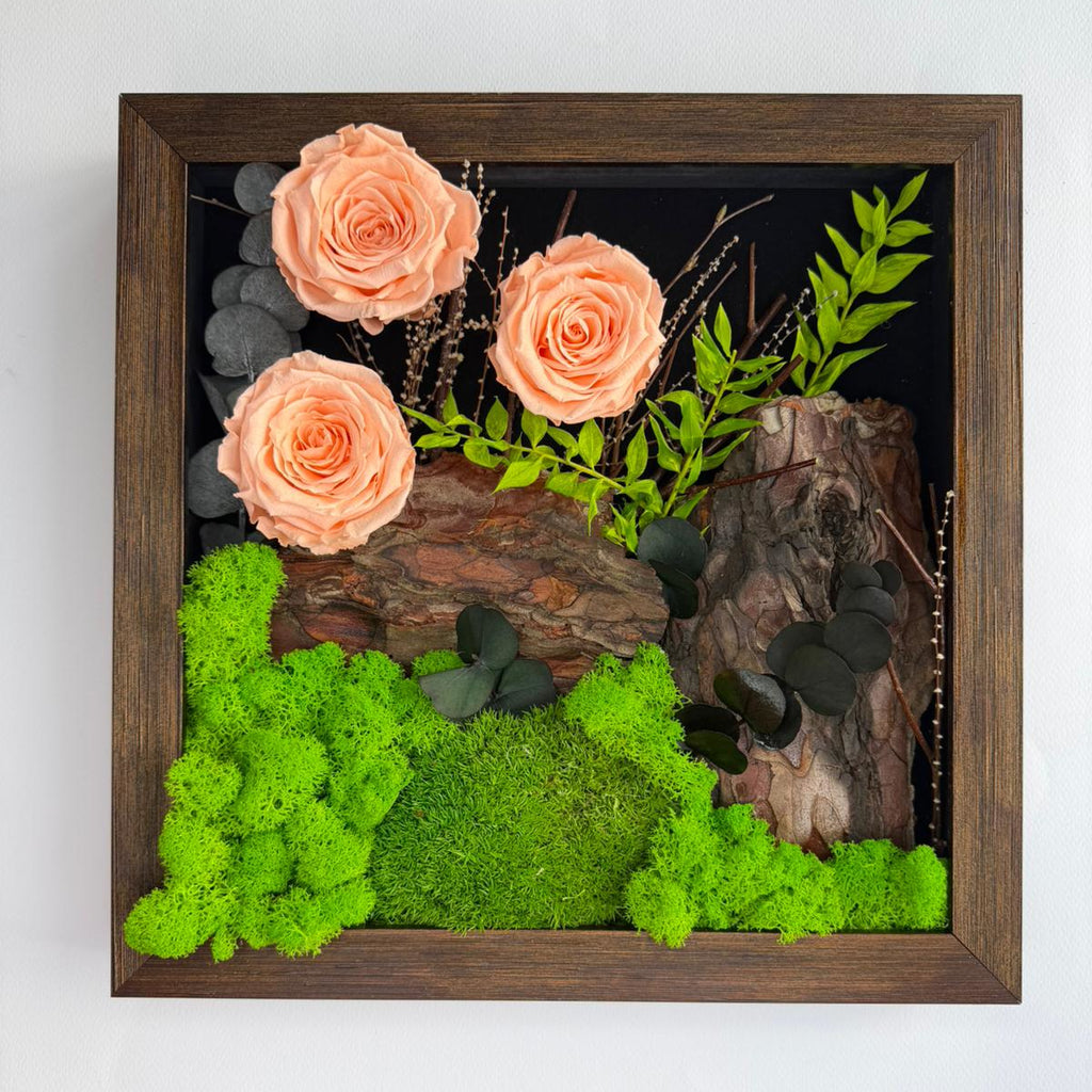 Tablou cu muschi si licheni, scoarta, trandafiri criogenati si plante stabilizate.