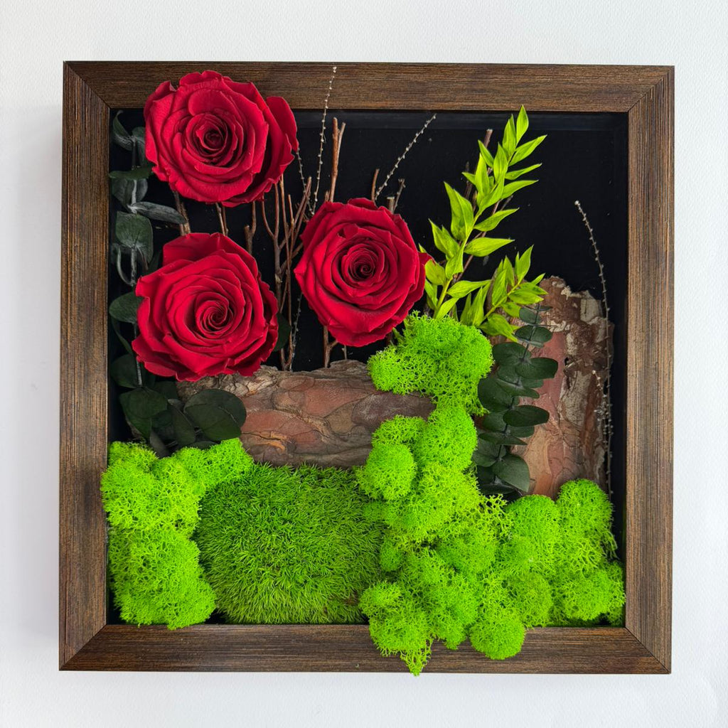 Tablou cu muschi si licheni, scoarta, trandafiri criogenati si plante stabilizate.